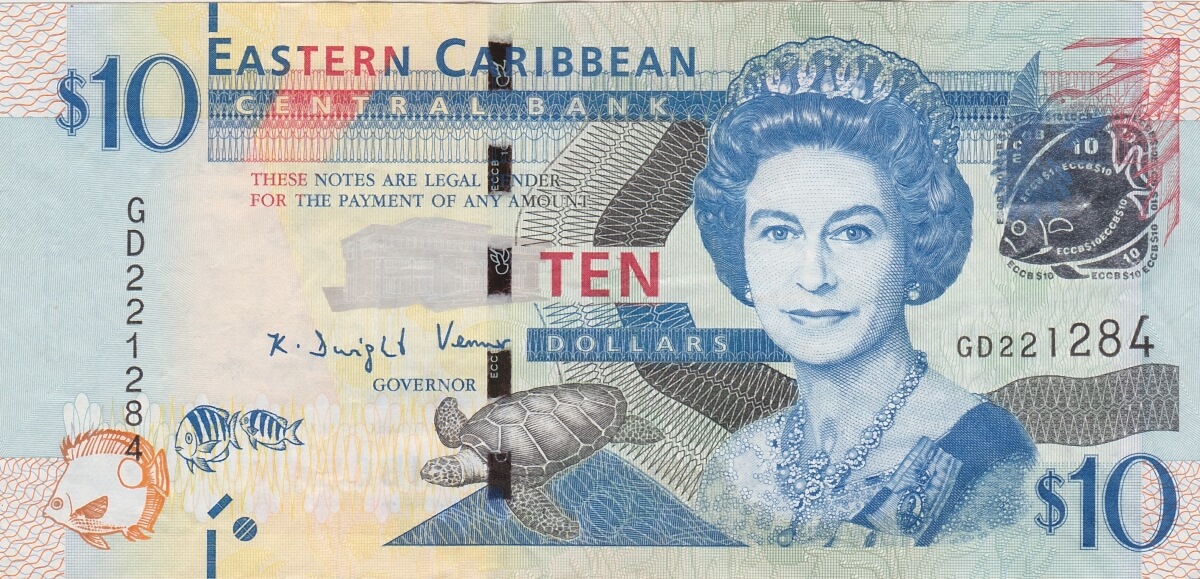 P52b East Caribbean States Ten Dollars Banknote. This ten dollars banknote was issued in 2015, with Prefix / Serial Number GD221284.P52b East Caribbean States Ten Dollars Banknote