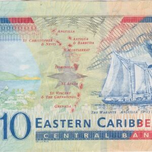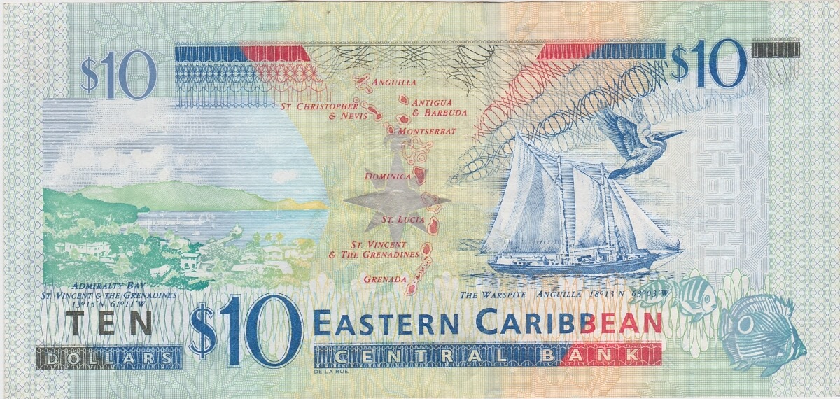 This East Caribbean States ten dollars features the portrait of Queen Elizabeth II, the ECCB building, a Green Sea Turtle, and a Green-throated Carib (Eulampis jugularis), and Fishes on the obverse. The reverse features Admiralty Bay in Saint Vincent and The Grenadines at the left, a Map of the Eastern Caribbean islands in the centre. The Warspite sailing ship Anguilla, and a brown Pelican (Pelecanus occidentalis) above, and Fishes at the bottom right.