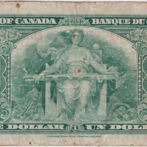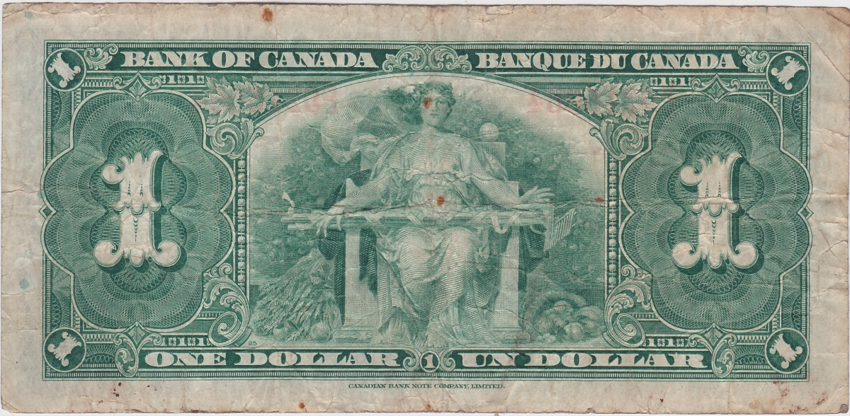 The obverse of this Canadian banknote features English text on the left and French text on the right. A black and white frame decorated with abstract forms and rosettes with the values “1” and “ONE / UN”. In the middle in an oval of the banknote is a portrait of King George VI in official attire. Background colour of the banknote is green. The reverse features an allegory of Agriculture sitting with tools on her lap. On the sides, at her feet, a cornucopia and a sheaf of wheat. All around her, we can see a vast decorative composition. The background colour of the banknote is green.