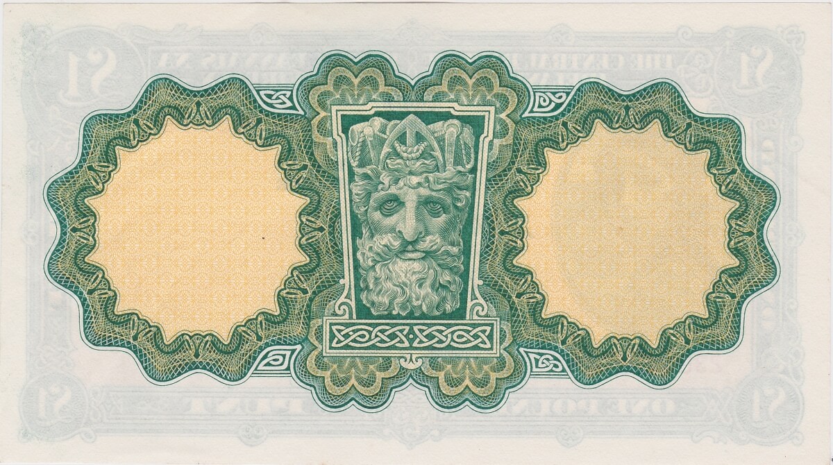 The obverse of this Republic Of Ireland banknote features Lady Hazel Lavery. The reverse features River Lee spirit.