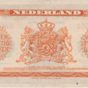 P67a Netherlands Twenty Five Gulden Banknote. This twenty five gulden banknote was issued on the 4th February 1943, with Prefix / Serial Number CA213564.P67a Netherlands Twenty Five Gulden Banknote