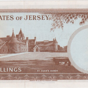 This Jersey banknote is brown on multicolour underprint. The note features Queen Elizabeth II at the right on the obverse. The reverse features St. Ouen’s Manor.