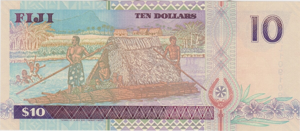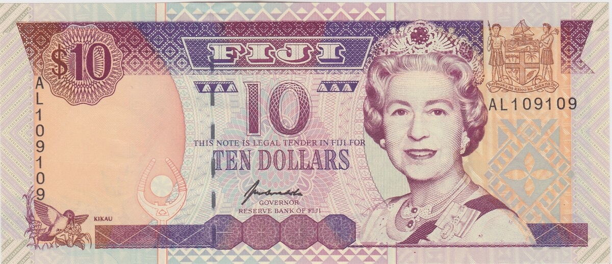 P98b Fiji Ten Dollars Banknote. This ten dollars banknote was issued in 1996, with Prefix / Serial Number AL109109. Featuring Queen Elizabeth II.P98b Fiji Ten Dollars Banknote