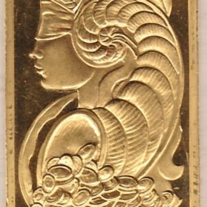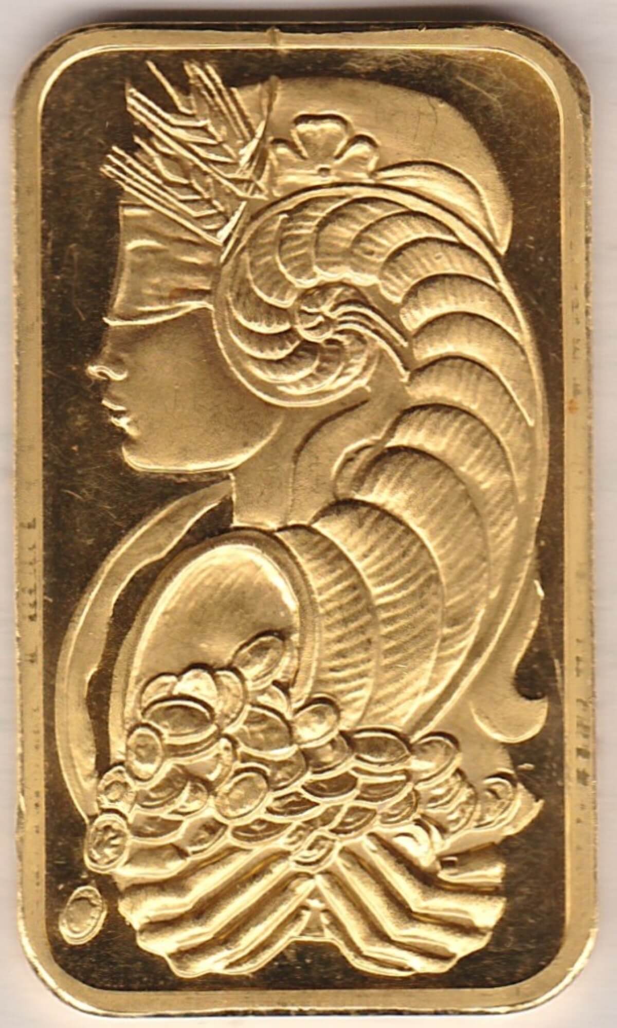 One side of this gold bar features the ‘Pamp’ logo along with the weight and fineness. The bar has also been inscribed ‘compliments of cargo staff sh japt’ at the edges. The other side features Lady Fortuna.