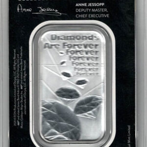 The obverse of this silver one ounce bar features the Royal Mint Logo & Legend, 007 Logo central, weight & fineness below with diamond shapes covering the background. The reverse features the James Bond film title ‘Diamonds Are Forever’ with diamond shapes below.