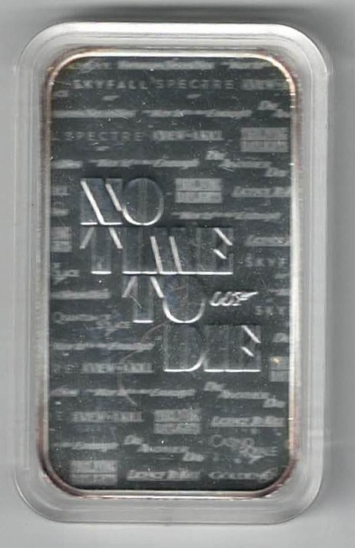 The obverse of this silver one ounce bar features the Royal Mint Logo & Legend, 007 Logo central, weight & fineness below. The reverse features the words no time to die.