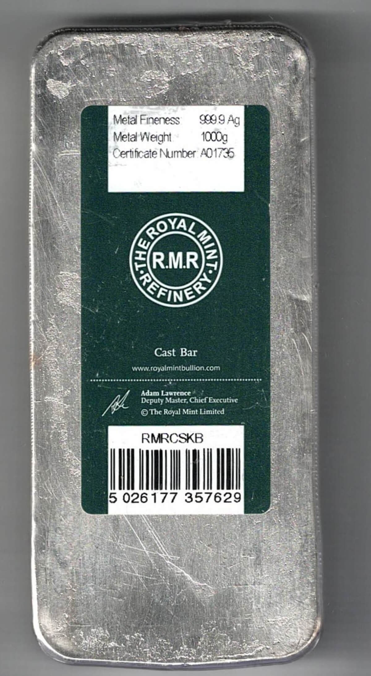 This bar contains one kilo of 999.9 fine Silver.
