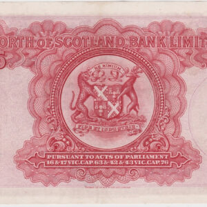 This North Of Scotland Bank Limited banknote features the arms at top left and right, with King’s College (Aberdeen) in centre on the obverse. The reverse features the bank arms in the centre.
