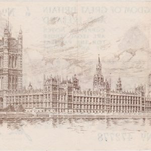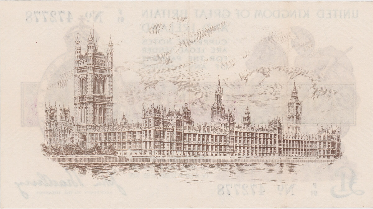 The T16 Bradbury banknote was issued by the HM Treasury. This note is brown and green. The obverse features the portrait of King George V at the right and St. George and Dragon at left. The reverse features the Palace of Westminster, housing the House of Commons and the House of Lords of the UK Government.