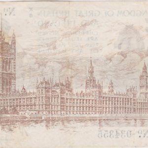 The T24 Warren Fisher banknote was issued by the HM Treasury. This note is brown and green. The obverse features the portrait of King George V at the right and St. George and Dragon at left. The reverse features the Palace of Westminster, housing the House of Commons and the House of Lords of the UK Government.