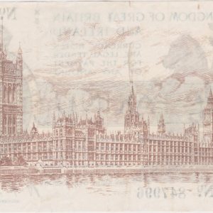 The T24 Warren Fisher banknote was issued by the HM Treasury. This note is brown and green. The obverse features the portrait of King George V at the right and St. George and Dragon at left. The reverse features the Palace of Westminster, housing the House of Commons and the House of Lords of the UK Government.