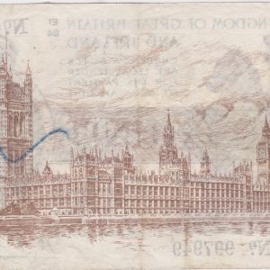 The T31 Warren Fisher banknote was issued by the HM Treasury. This note is brown and green. The obverse features the portrait of King George V at the right and St. George and Dragon at left. The reverse features the Palace of Westminster, housing the House of Commons and the House of Lords of the UK Government.