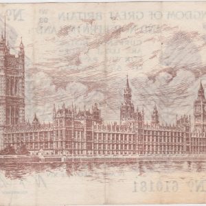 The T35 Warren Fisher banknote was issued by the HM Treasury. This note is brown and green. The obverse features the portrait of King George V at the right and St. George and Dragon at left. The reverse features the Palace of Westminster, housing the House of Commons and the House of Lords of the UK Government.