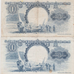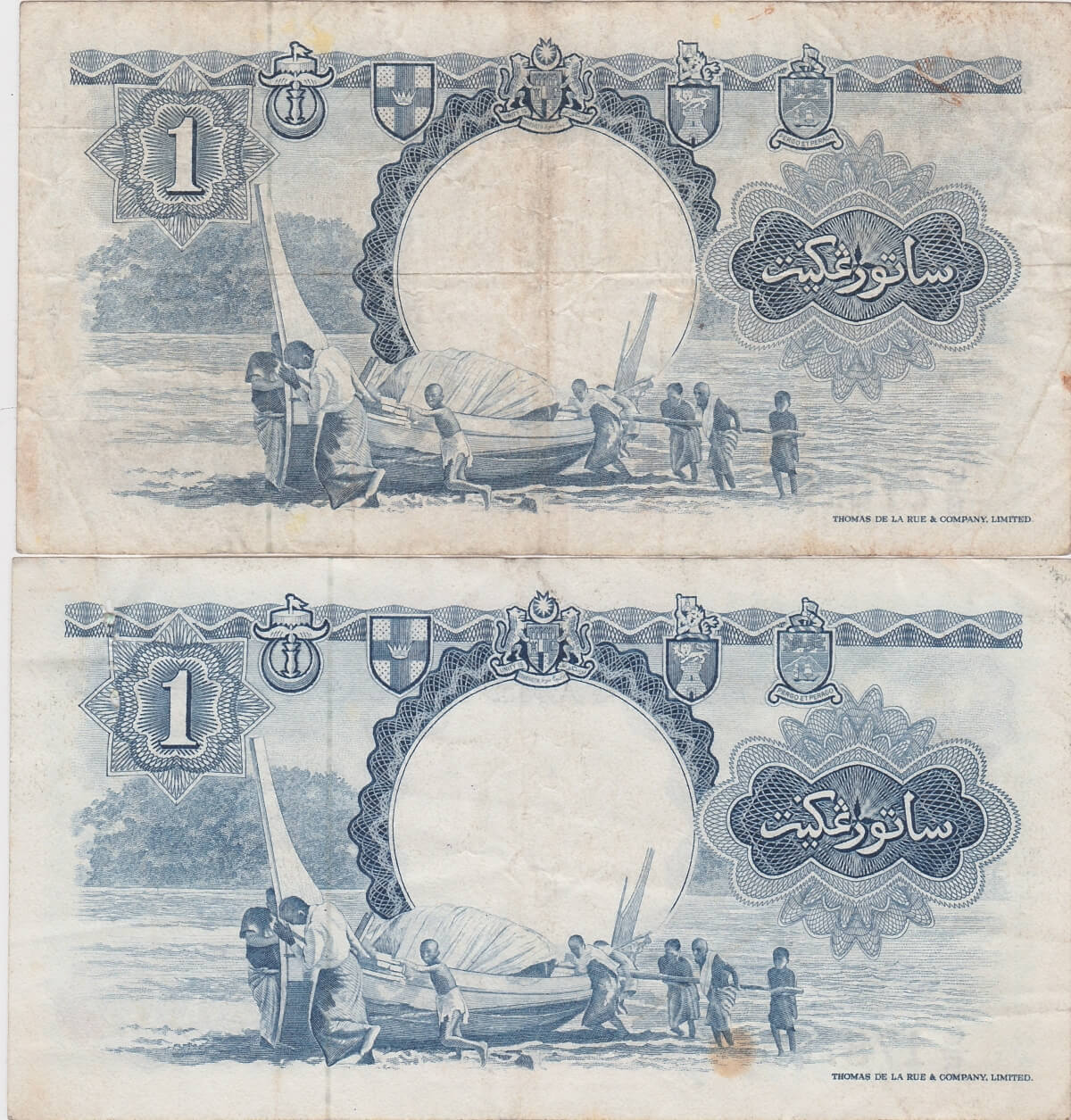 The Malaya And British Borneo One Dollar banknote is blue on multicolour underprint. The obverse features a sailing boat at the left. The reverse features the arms of Brunei, Sarawak, Federation of Malaya, Singapore and North Borneo at the top. And a fishing boat at bottom.